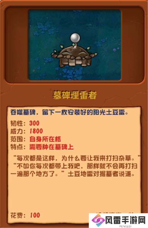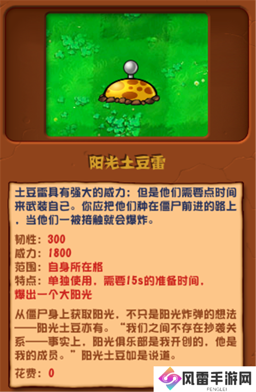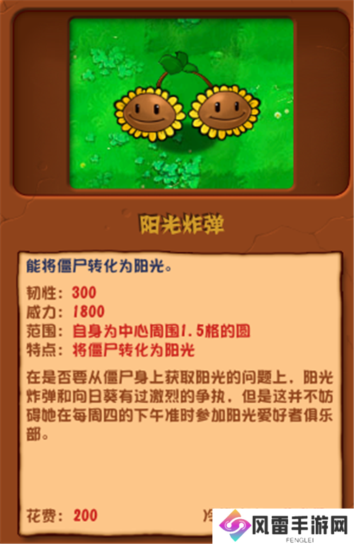 评价:樱桃炸弹与向日葵的完美结合,适合在僵尸潮时清场并获大量阳光。非紧急情况,阳光土豆更为优选。