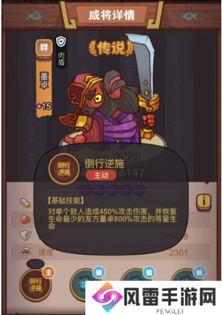 董卓:董卓是群雄传说品质的咸将,拥有较强的防御,对单个敌人可造成大量伤害。