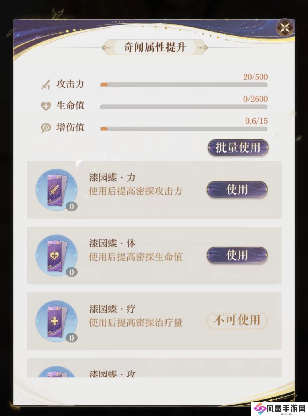 目前游戏的漆园蝶只有五种,由于郭嘉是输出类型的密探,所以小伙伴们主要提升他的攻击力,不过道具数量有限,小伙伴们还是要多刷一刷,毕竟在做任务的时候是随机获取的。