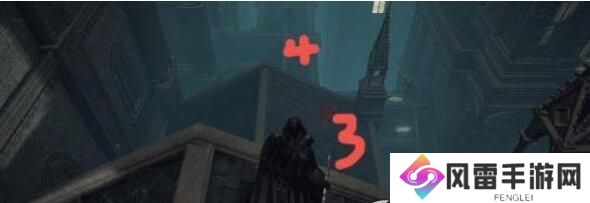 4、我们按照如图所示标注顺序,下来后先跳一号房顶再跳二号房顶然后跳三号最后四号跳下来,再回头后走下去即可看到房顶跳下去。