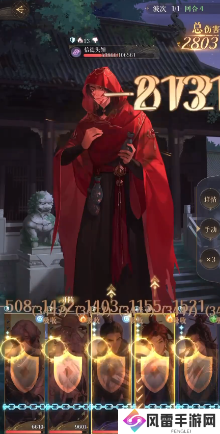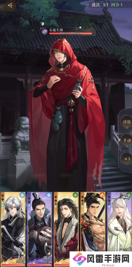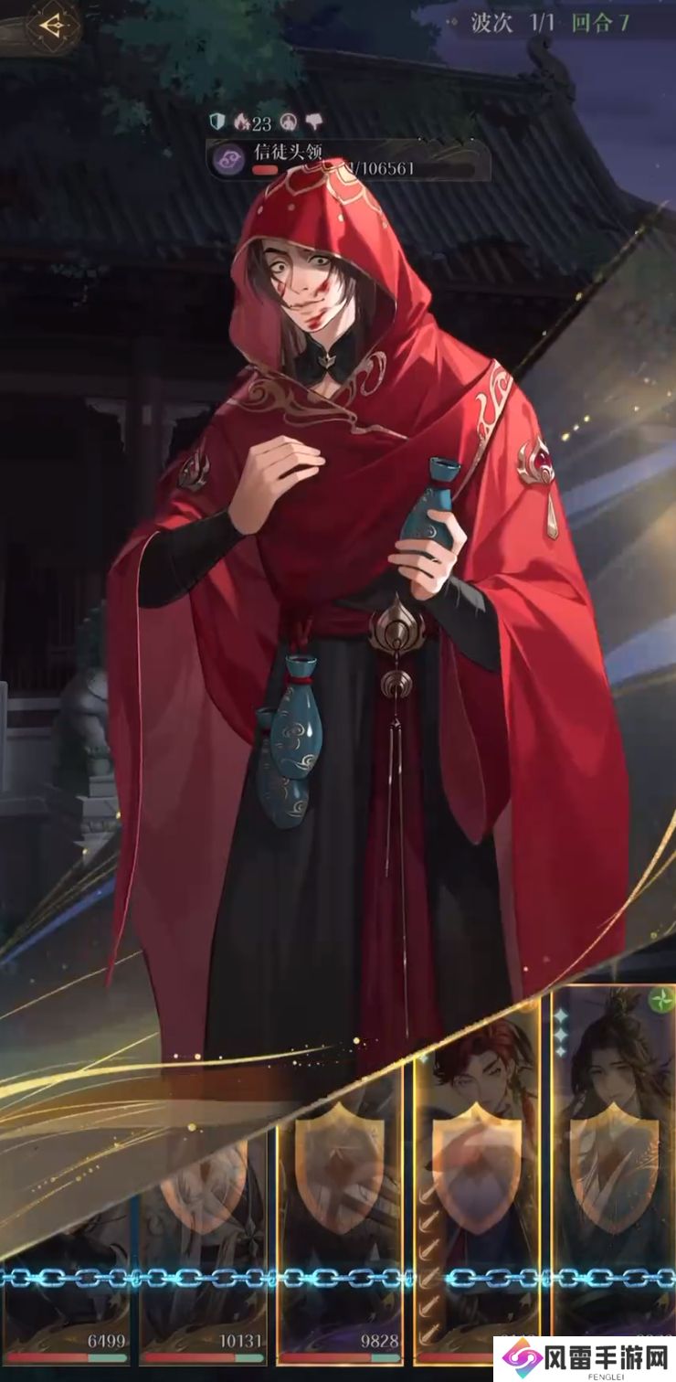 第8回合扛到boss的第2个大招,全员除史子眇以外有大就放。从第11~12回合开始,信徒头领血量濒危,郭嘉准备随时退场炸一轮boss同归于尽,实现一回合打出爆炸伤害。最后一轮的要点就在于颜良要足够高血量,并且王粲的链条要与颜良的盾同时存活,否则敌我双方全灭的情况会判挑战失败。