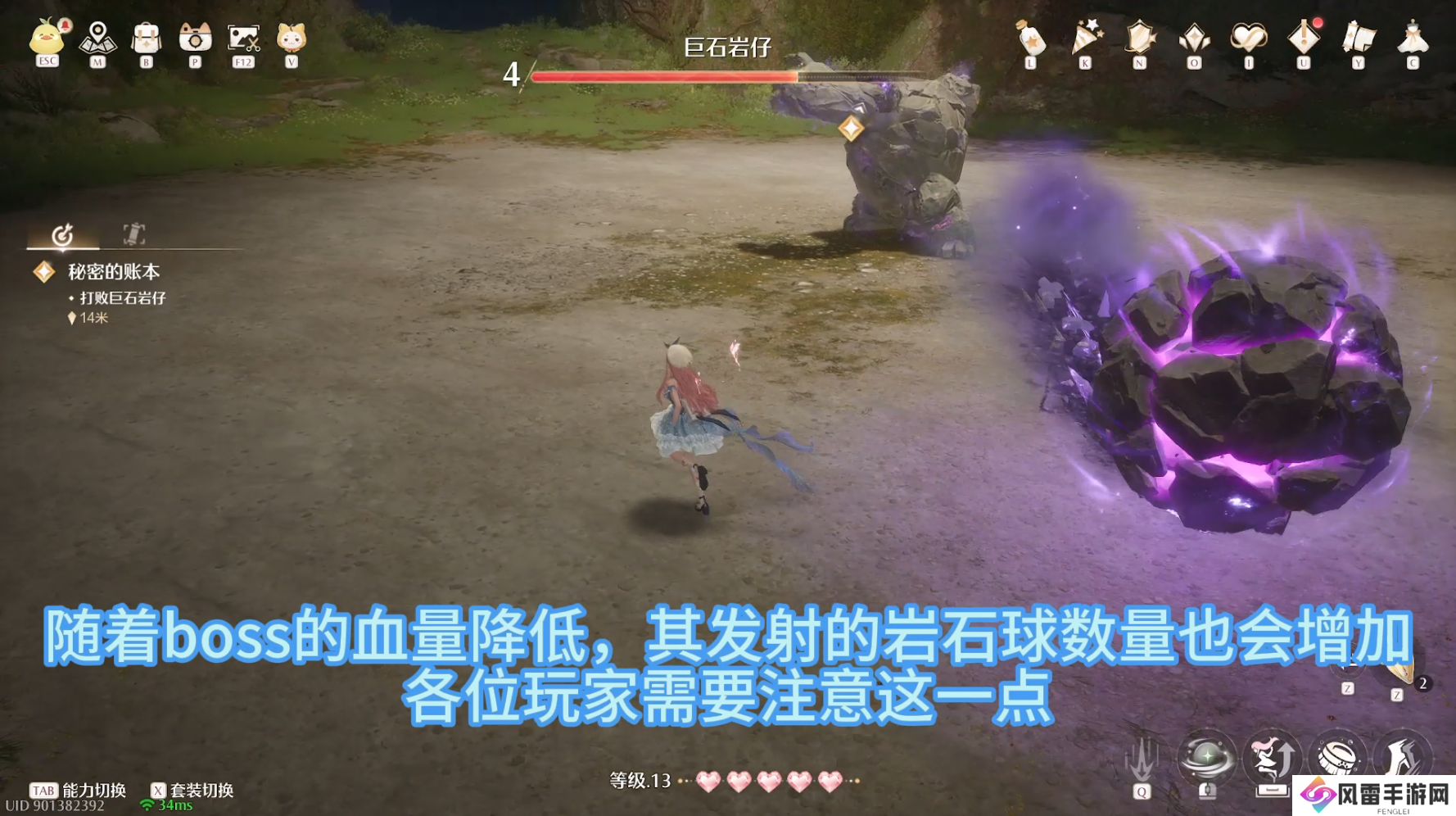 他的血条左边的次数为剩余,需要攻击的次数打到0,极为挑战成功。随着血量降低,其发射的岩石球数量也会增加。各位玩家需要注意这一点,当boss连续发射连射球的时候,我们可以左右来回走位规避,如果走位不慎可以使用闪避补救。