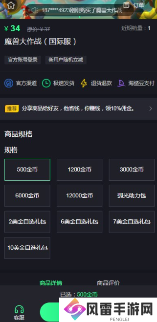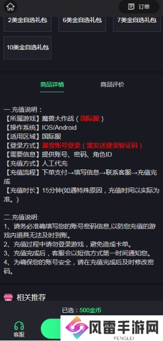 第二步、打开代充网站之后直接就是“魔兽大作战国际服”的充值界面,充值的规格有很多种,玩家可以按照个人的需求去选择对应的充值金额。
