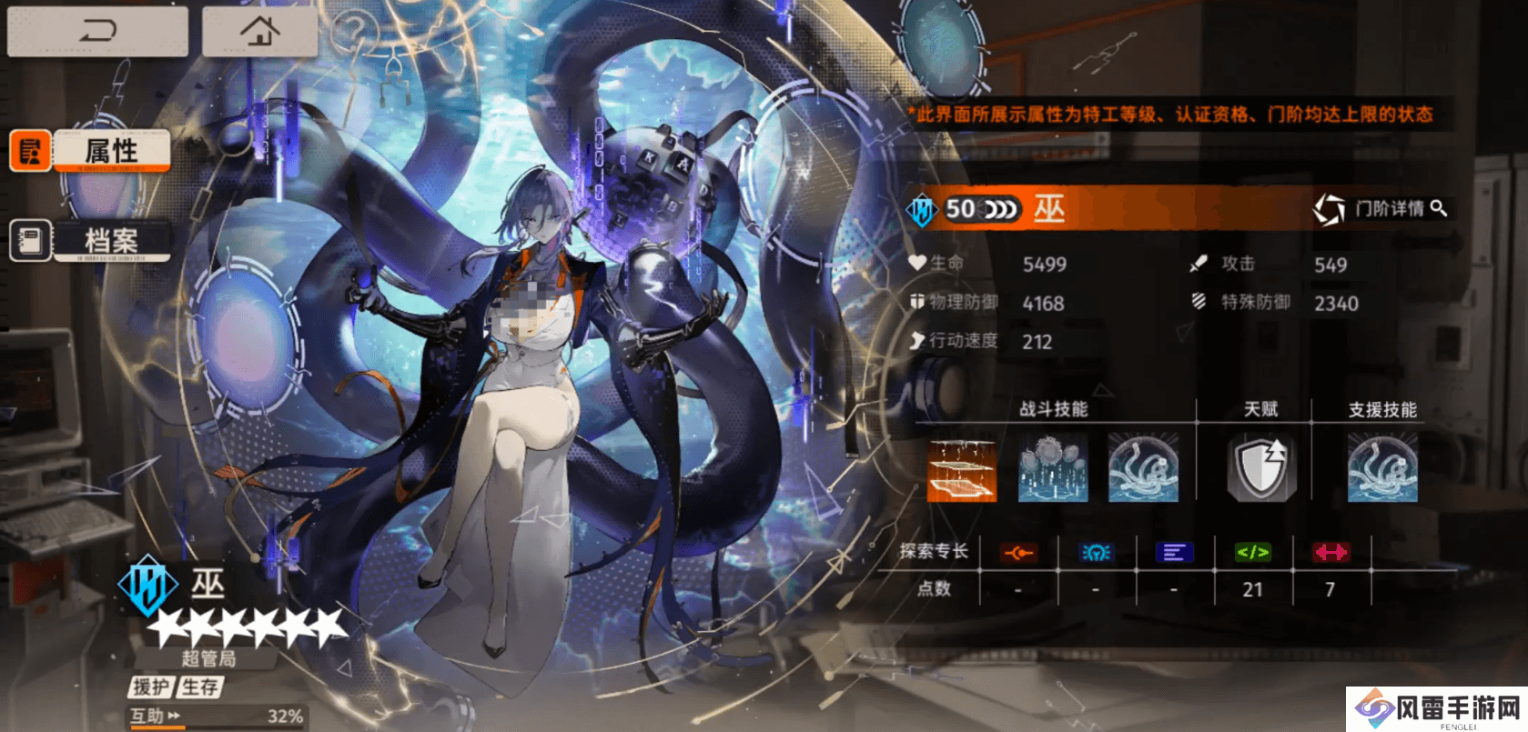 巫的普攻会对选定的敌人造成物理伤害,并降低目标10%攻击力一回合;她的战术技会增加全部队友20%物理防御,并降低全体敌人10%攻击力两回合;她的超限技会先增加自身30%的物理防御,随后为全体队友提供援护两回合,在援护过程中队友所受伤害会降低40%,援护持续时间结束的时候,如果未进行援护保护会获得20点能级,如果进行了援护,则对自身进行一次治疗;