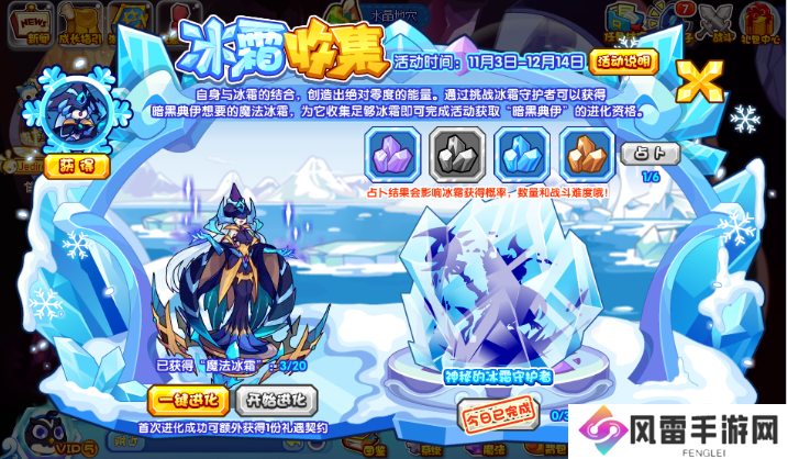 水晶数种类决定挑战难度和战胜后获得的魔法冰霜数量,点亮水晶越多,挑战难度越低,获得魔法冰霜越多!