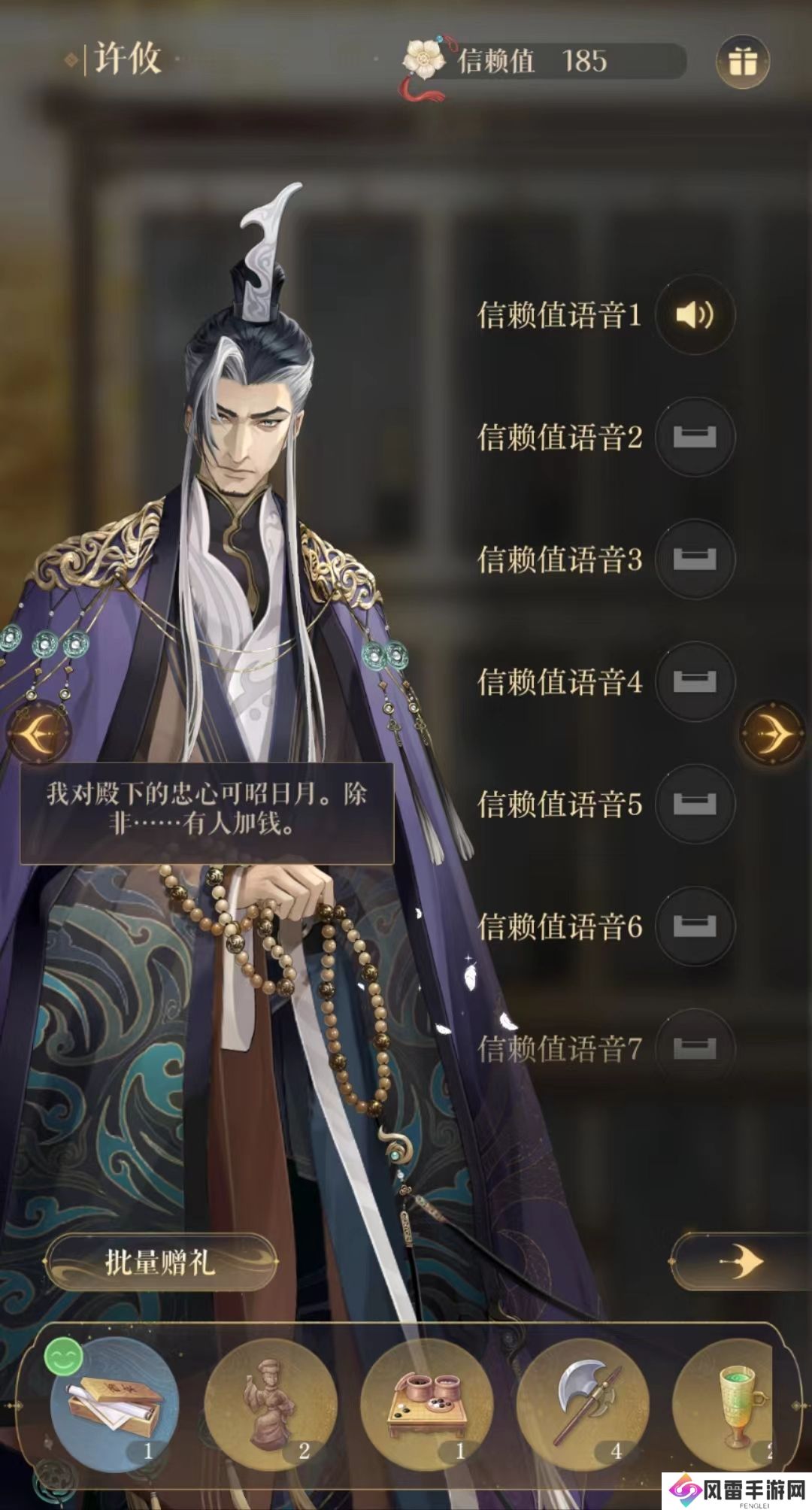 不过小伙伴们想要解锁全部的命盘,将他们的星石都搭配上的话,是需要按照一定的条件去解锁的,比如许攸的修为到达六,信赖值到达2000,这个需要大家自己去提升,至于信赖值通过送礼就可以了,送密探喜欢的礼物可以增加更多的信赖值,密探喜欢的礼物都会有一个笑脸标志。