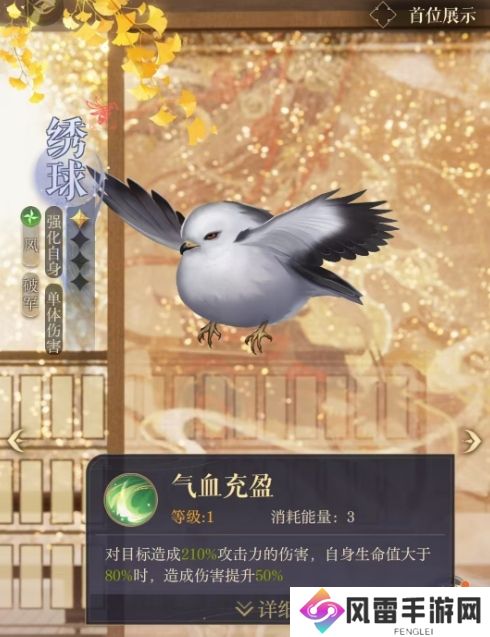 绣球的话,其技能主打的便是攻击,并且在角色自身的生命大于80%的时候,其效果往往也会更加的突出,能针对敌人造成伤害额外增加80%,所以只要绣球的生命百分比越高,那么就越容易触发这个额外的伤害增加。