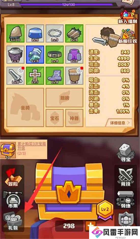 疯狂骑士团玩法攻略:1、副本:拥有一身装备以后,可以去解锁副本玩法,战胜面前的敌人可以获得更多的游戏奖励。2、任务:完成对应的游戏任务可以获得宝箱、宝石等资源,任务的种类不同且完成的条件也不同。3、抽奖:核心装备获得,可通过抽取中间的宝箱获得装备,等级越高获得的高品质的装备几率越大。