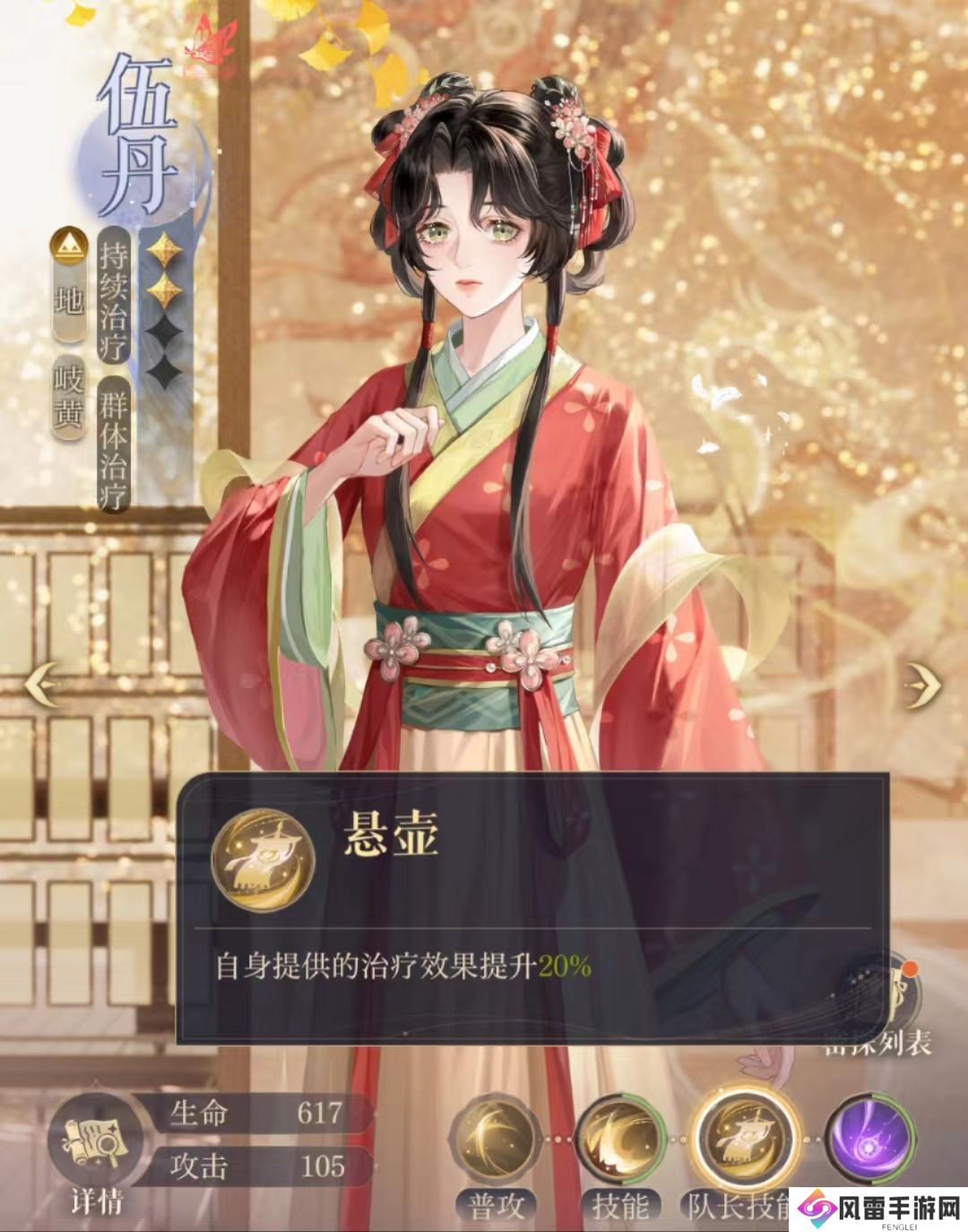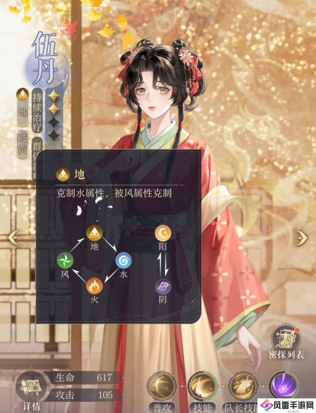 伍丹的属性是地,可以克制水属性的密探,但是会被风属性的对手克制,在排队伍的时候,小伙伴们还是要注意一下对手的属性的。她简单的普攻技能就能够给队友治疗,一般在队友没有受伤的情况下,建议小伙伴们可以让伍丹下拉自我防御。