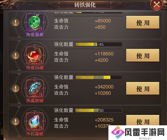 铸铁强化作为一个消耗稀贵材料提升角色生命值、攻击力、技能伤害从而提升战斗力的一个隐形平台,这里为啥说它是一个隐形的平台呢?平时其实很多玩家在疑问为啥装备一样,人家的战斗力就是比我高很多呢?其实除了人物角色的幻化系统中的幻化柜分解等级等多个地方隐形看不到,这里就是其中一个战力拉开差距的关键点,这个材料只有在平时幻化武器活动中可合理提升至满级,待角色等级提升或是系统修改这个铸铁数量上限后也会相应提升上限。