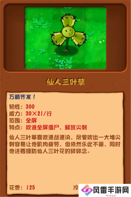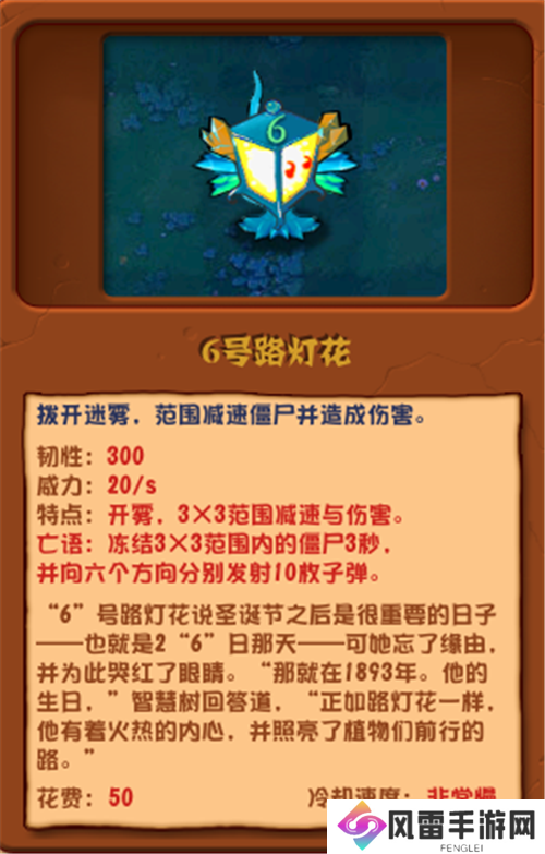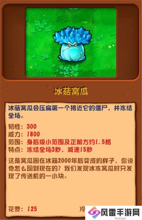 评价:与雪花寒冰菇相媲美的一次性全屏伤害植物,结合仙人掌子弹的穿透效果,清杂能力超群。建议在大批僵尸来袭时使用。