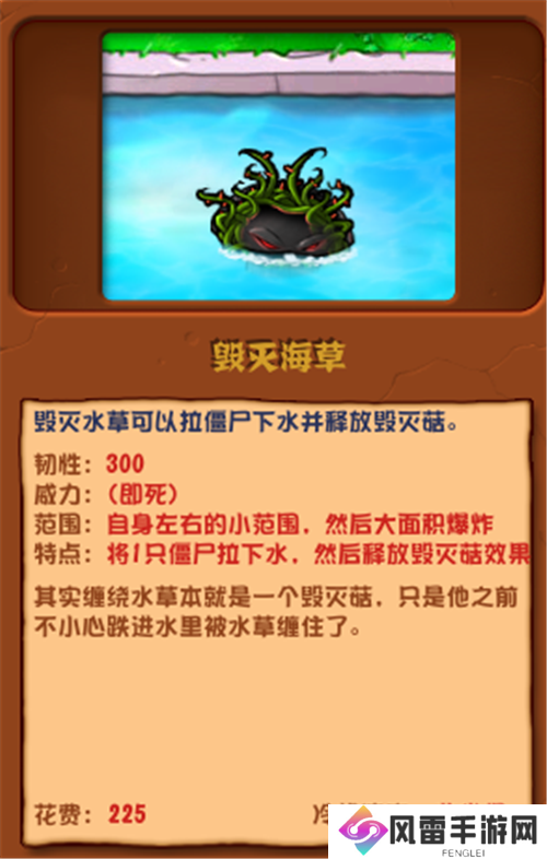 评价:水中霸主,唯一的概念神级存在。被其捕获的僵尸都将面临毁灭,并伴随毁灭菇的毁灭效果。推荐在面对伽刚特尔等多种形态僵尸时使用。