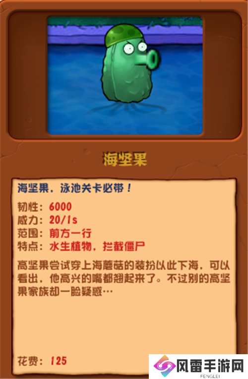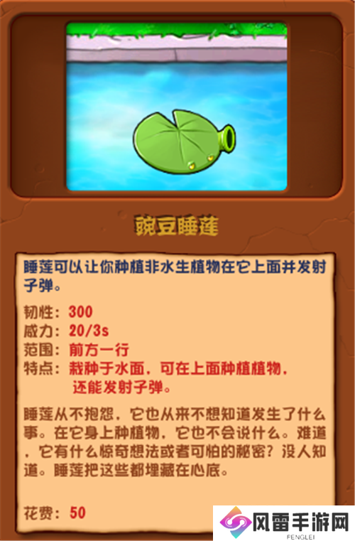 评价:前期水上防御的得力助手,仅需125阳光即可拥有不俗的防御与攻击力。最吸引人的是,无需额外种植睡莲!