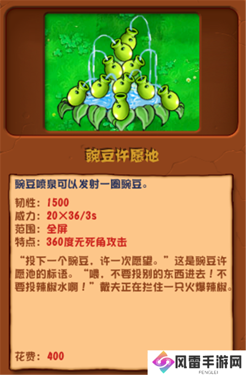 评价:400阳光的高昂代价,却仅发射普通豌豆。宛如将豌豆捧在掌心,它却将你推向僵尸的怀抱。建议搭配附魔型植物,以增强其实战效果。