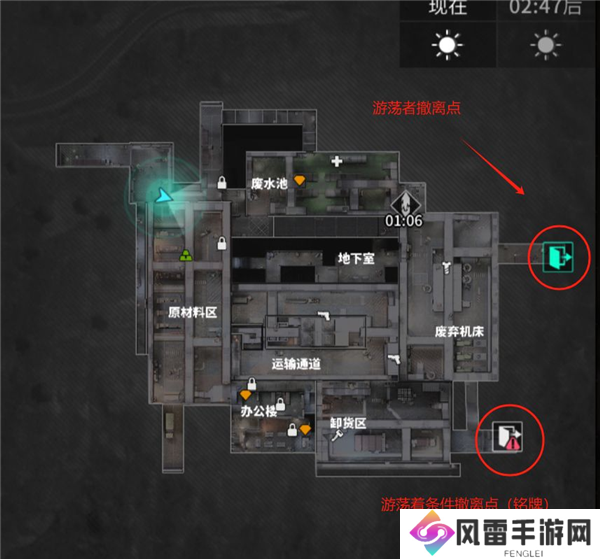 选择游荡者开局与一般对局不同,游荡者有专属的撤离点,同样也分为撤离点和条件撤离点,比如在巴夫工厂这张地图,萤火虫的撤离点在左侧,而游荡者的撤离点在地图的右侧,如果大家想玩游荡者的话,要注意这点(不同时段撤离点位置会有变化,本局游荡者撤离点如图示)。