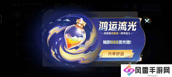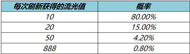 80%的概率获得10点流光值,15%的概率获得20点流光值,4.2%的概率获得50点流光值,0.8%的概率获得888点流光值。