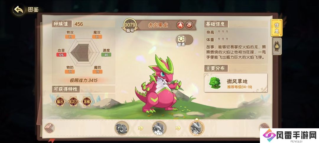 好吃的火龙果,但是却有极强的战斗续航,特性龙之力,赋予了它使用龙系技能时,可以恢复自身8%生命值的天赋,进化后的赤炎果龙种族值可达456,血量属性来到了126,大大提升了在对战时,拖延敌方精灵节奏的能力