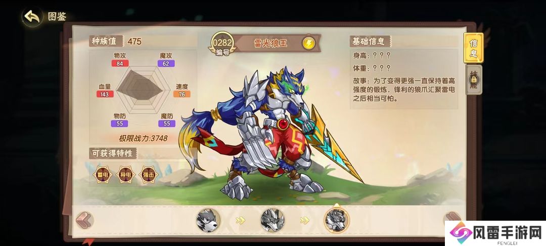 帅气的雷光狼王相信是很多小西普的梦中精灵,475的种族值在所有精灵中也是相当靠前的存在,实力不容小觑,作为一只在游戏前期就能够获得的精灵,只要参与雷光一族活动就能免费获取哦~